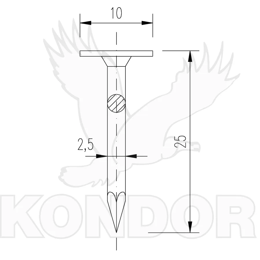 Pozinkovaný hřebík vhodný pro zatlučení do krytiny. Rozměry 25 × 2,5 mm. V balení po 2,5 kg.
