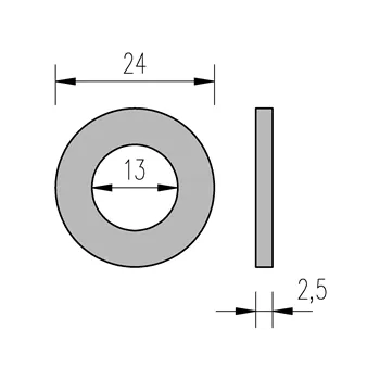 Podložka plochá kulatá s otvorem. Průměr otvoru 13 mm pro šrouby a závitové tyče M 12. Celkový průměr 24 mm. Tloušťka 2,5 mm. Vyrobeno z oceli. Pro vnitřní i venkovní použití.