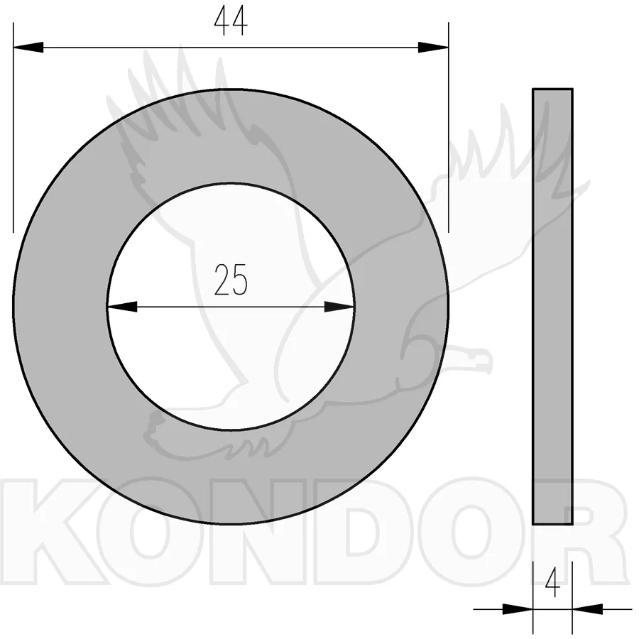 Podložka plochá kulatá s otvorem. Průměr otvoru 25 mm pro šrouby a závitové tyče M 24. Celkový průměr 44 mm. Tloušťka 4 mm. Vyrobeno z oceli. Pro vnitřní i venkovní použití.