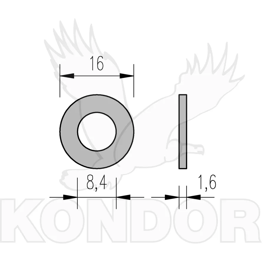 Podložka plochá kulatá s otvorem. Průměr otvoru 8,4 mm pro šrouby a závitové tyče M 8. Celkový průměr 16 mm. Tloušťka 1,6 mm. Vyrobeno z oceli. Pro vnitřní i venkovní použití.