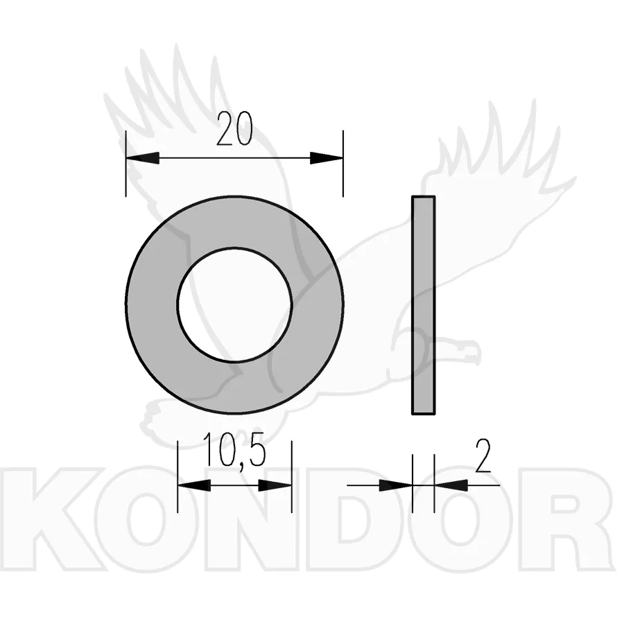Podložka plochá kulatá s otvorem. Průměr otvoru 10,5 mm pro šrouby a závitové tyče M 10. Celkový průměr 20 mm. Tloušťka 2 mm. Materiál nerez. Pro vnitřní i venkovní použití.