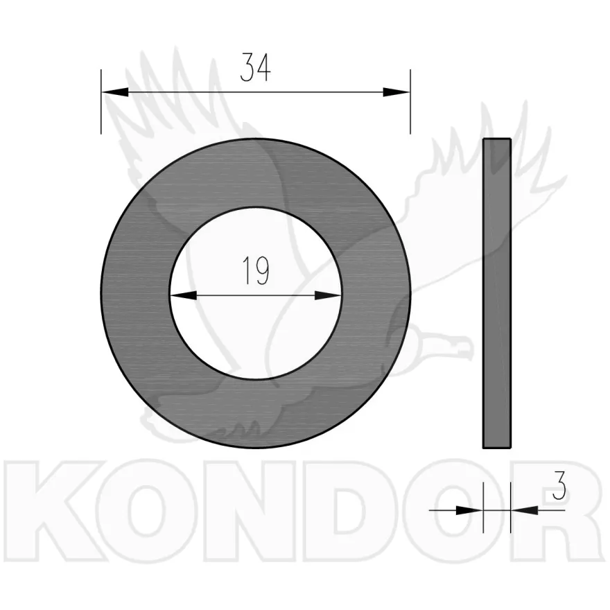Podložka plochá kulatá s otvorem. Průměr otvoru 19 mm pro šrouby a závitové tyče M 18. Celkový průměr 34 mm. Tloušťka 3 mm. Materiál pozinkovaný. Pro vnitřní i venkovní použití.