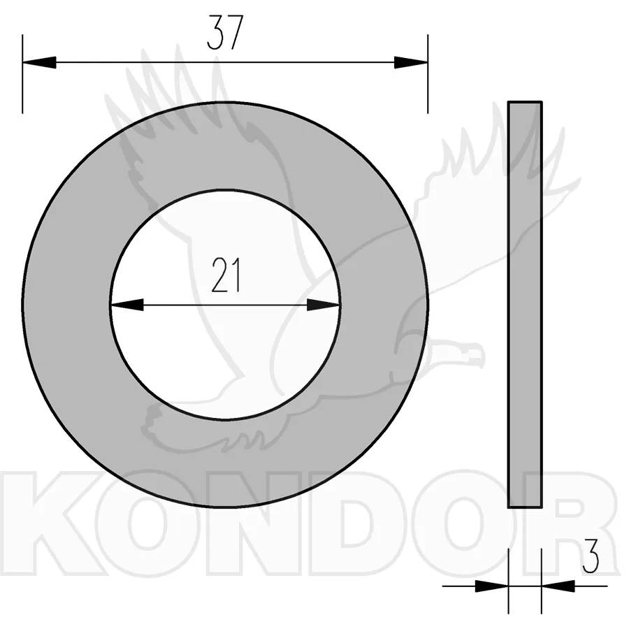 Podložka plochá kulatá s otvorem. Průměr otvoru 21 mm pro šrouby a závitové tyče M 20. Celkový průměr 37 mm. Tloušťka 3 mm. Materiál pozinkovaný. Pro vnitřní i venkovní použití.
