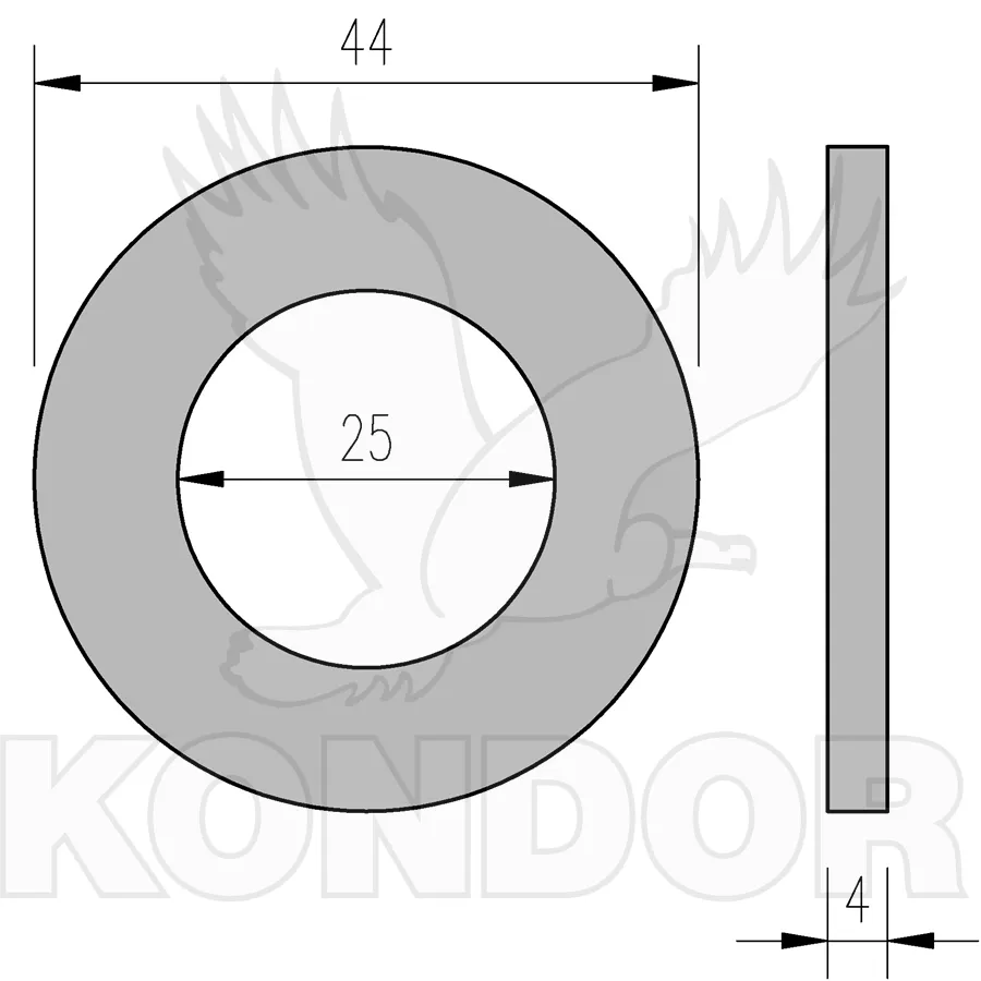 Podložka plochá kulatá s otvorem. Průměr otvoru 25 mm pro šrouby a závitové tyče M 24. Celkový průměr 44 mm. Tloušťka 4 mm. Materiál pozinkovaný. Pro vnitřní i venkovní použití.