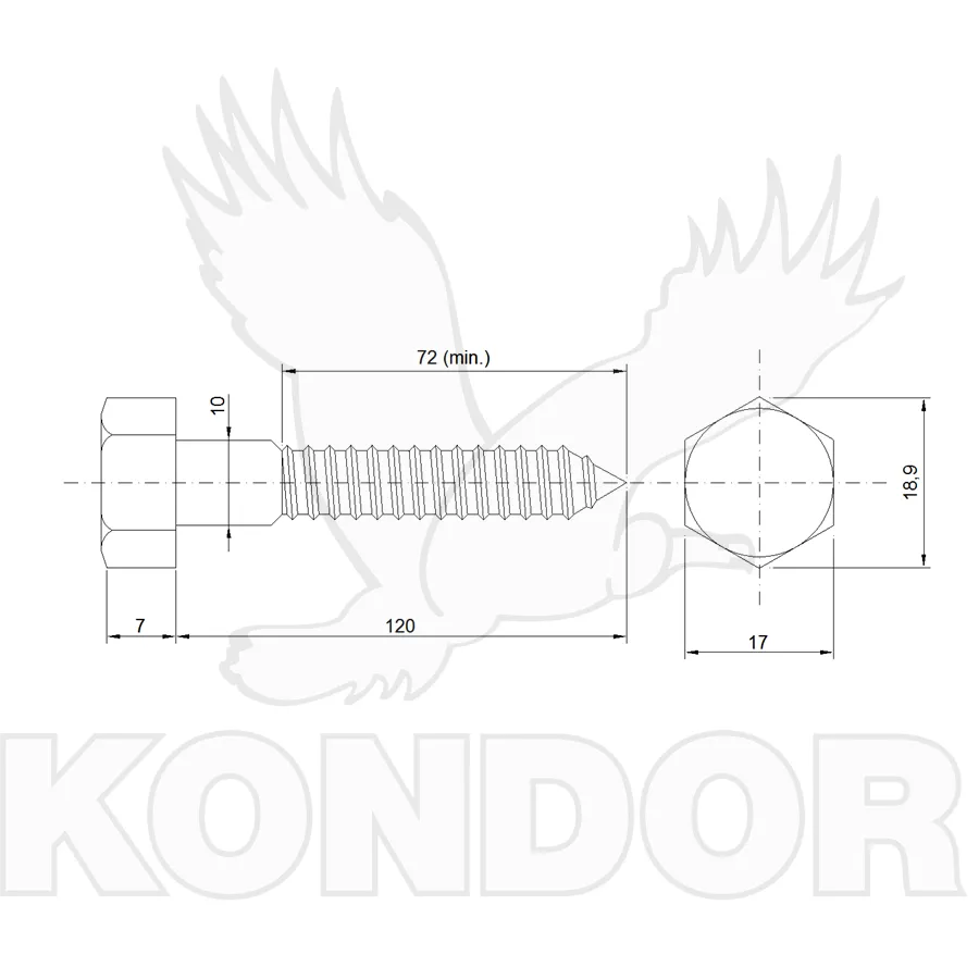 Pozinkovaný vrut se šestihrannou hlavou. Vhodný pro stavbu dřevěných konstrukcí. Průměr 10 mm, délka 120 mm.