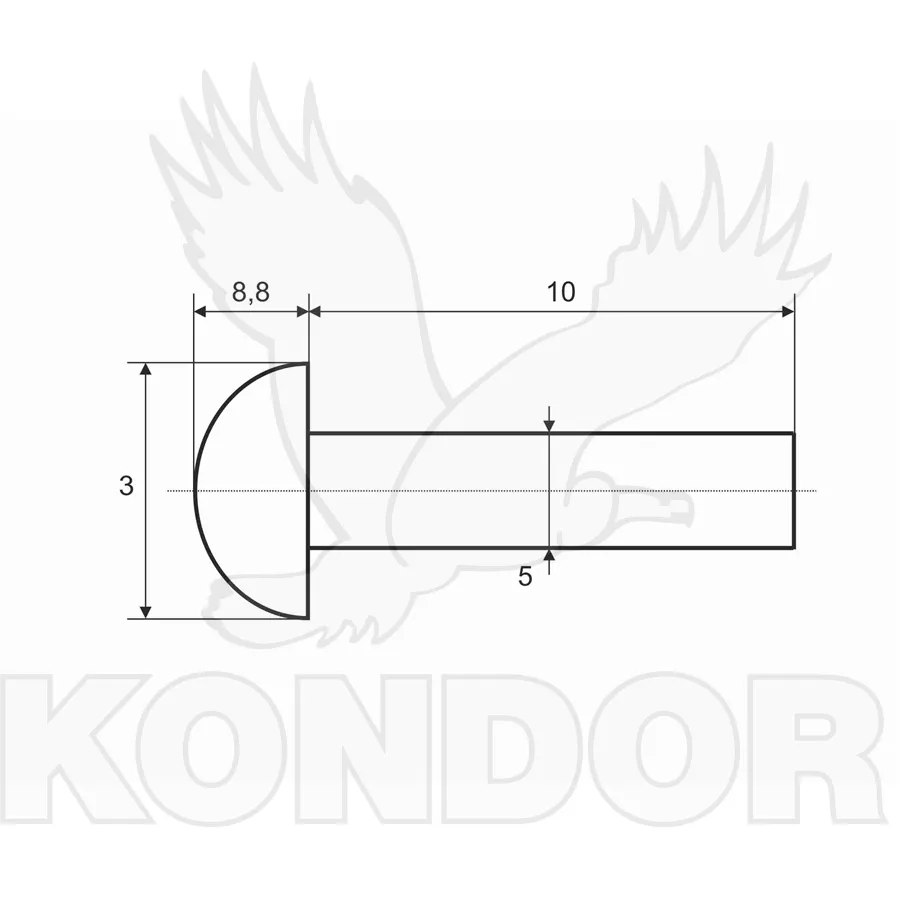 Nýt s půlkulatou hlavou. Materiál ocel bez povrchové úpravy. Rozměry 5 × 10 mm.