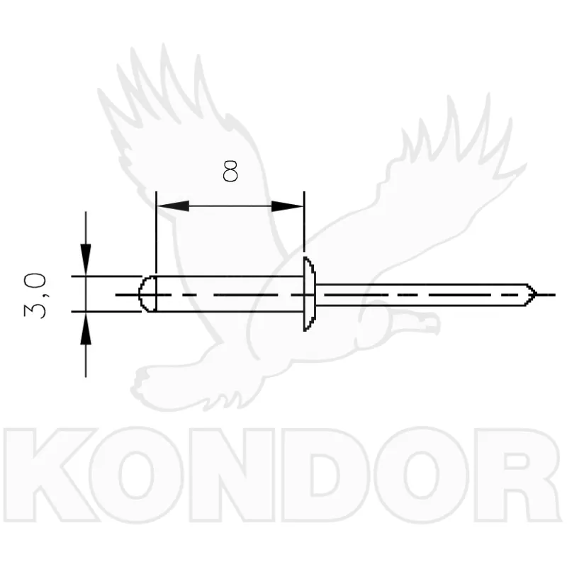 Hliníkový trhací nýt s trnem z oceli. Průměr nýtu 3 mm, délka 8 mm.