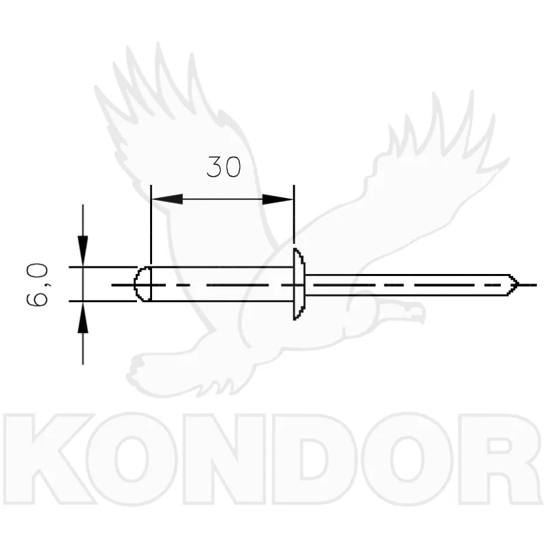 Hliníkový trhací nýt s trnem z oceli. Průměr nýtu 6 mm, délka 30 mm.