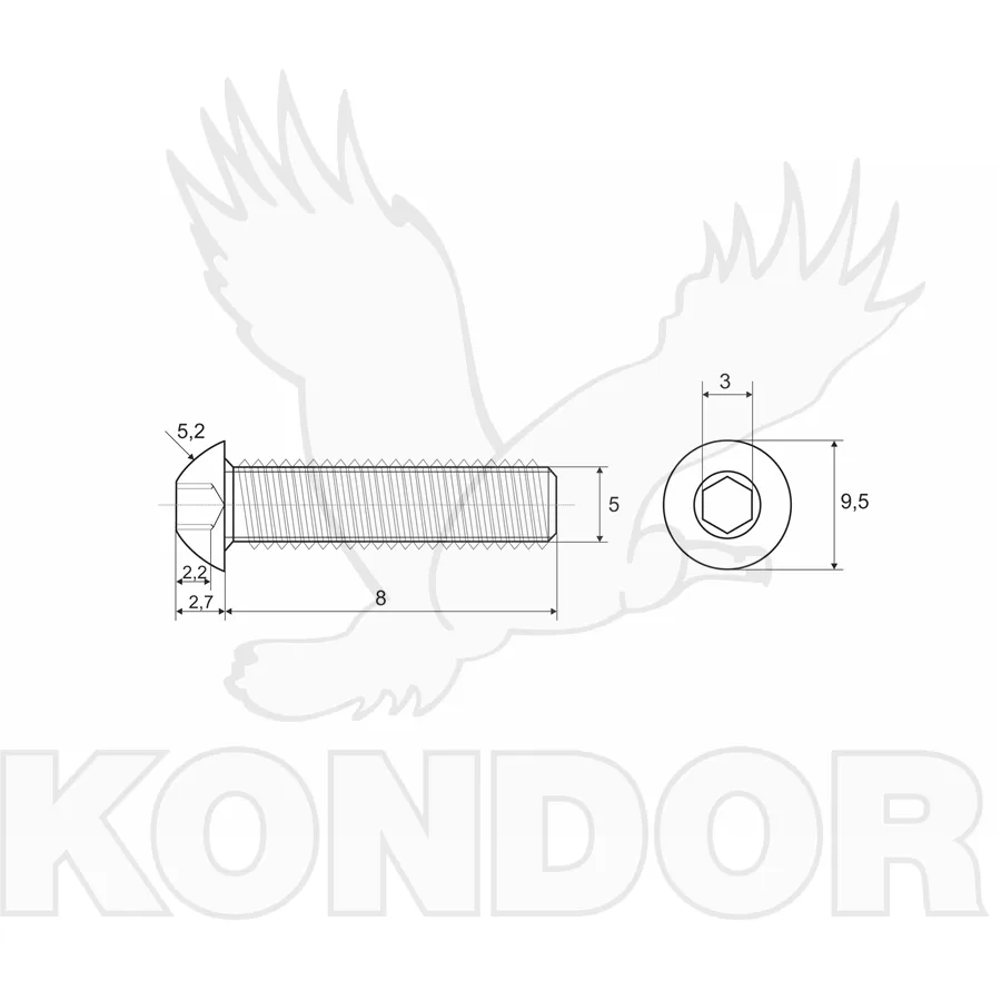 Pozinkovaný šroub se závitem M 5 × 8 a půlkulatou hlavou s vnitřním šestihranem.