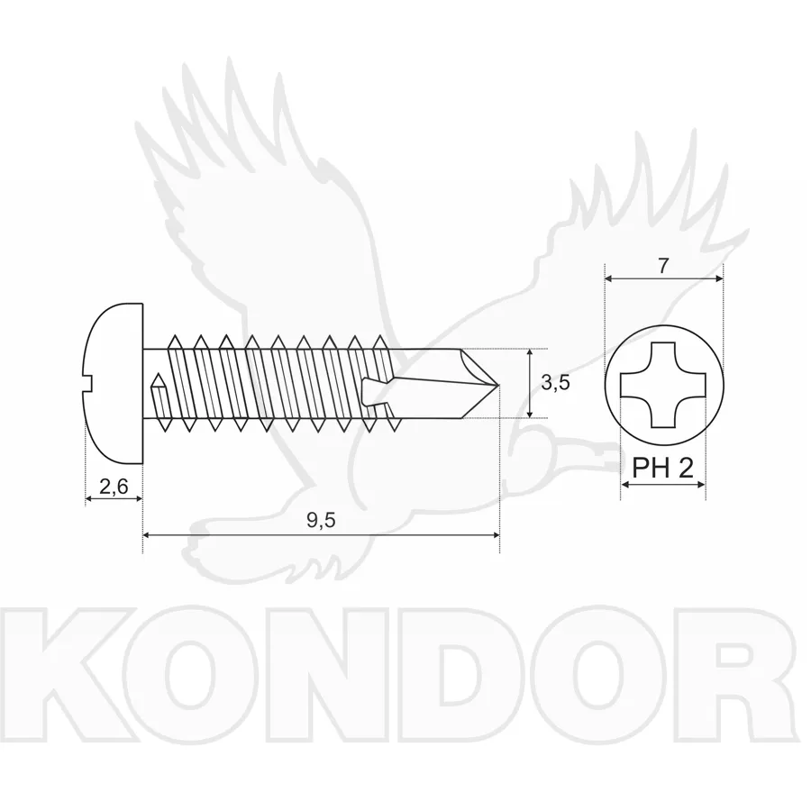 Samořezný šroub do plechu s TEX hrotem (vrtáčkem) pro snadné zavrtání a zapuštěnou hlavou. Materiál pozinkovaný. Rozměry 3,5 × 9,5 mm.