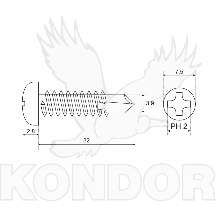 Samořezný šroub do plechu s TEX hrotem (vrtáčkem) pro snadné zavrtání a zapuštěnou hlavou. Materiál pozinkovaný. Rozměry 3,9 × 32 mm.