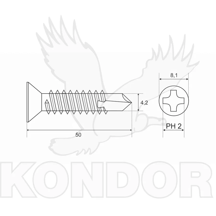 Samořezný šroub do plechu s TEX hrotem (vrtáčkem) pro snadné zavrtání a zapuštěnou hlavou. Materiál pozinkovaný. Rozměry 4,2 × 50 mm.