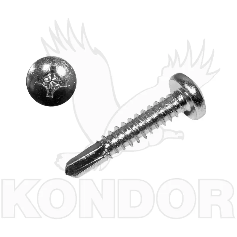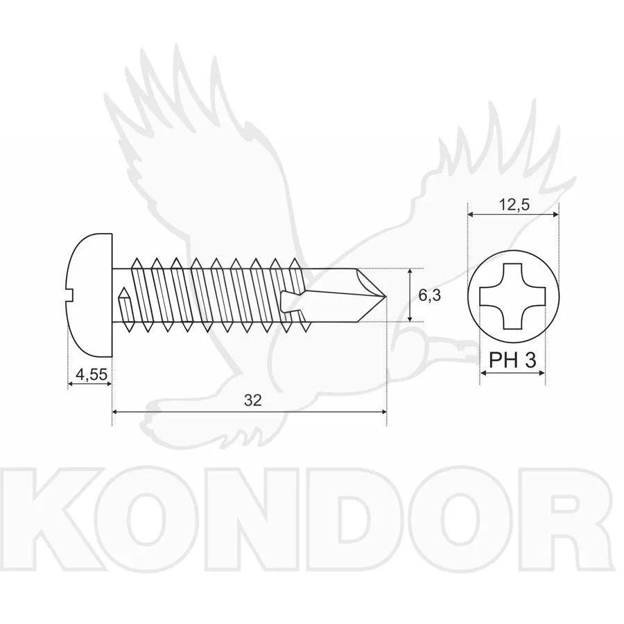 Samořezný šroub do plechu s TEX hrotem (vrtáčkem) pro snadné zavrtání a s půlkulatou hlavou. Materiál pozinkovaný. Rozměry 6,3 × 32 mm.