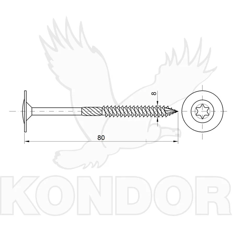Vrut do dřeva s velkoplošnou hlavou TORX 40, který je vhodný pro konstrukce staveb. Materiál pozinkovaný. Rozměry 8 x 80 mm.
