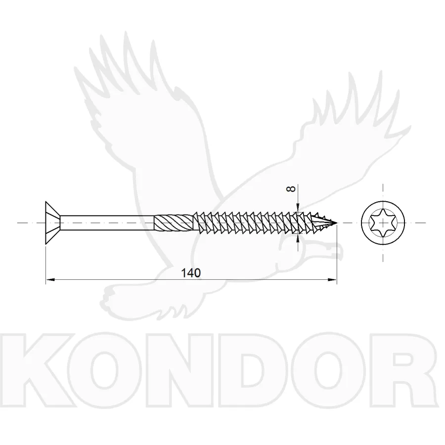 Vrut do dřeva se zápustnou hlavou TORX 40, který je vhodný pro konstrukce staveb. Materiál pozinkovaný. Rozměry 8 x 140 mm.