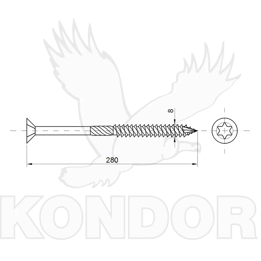 Vrut do dřeva se zápustnou hlavou TORX 40, který je vhodný pro konstrukce staveb. Materiál pozinkovaný. Rozměry 8 x 280 mm.