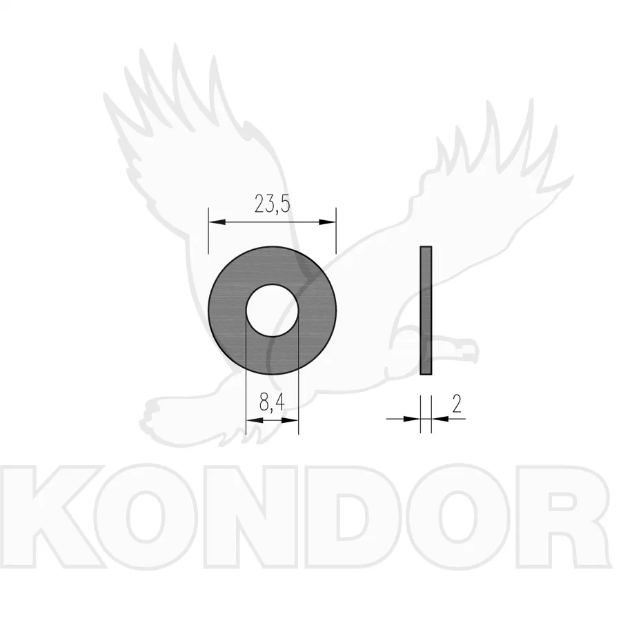 Velkoplošná podložka pod nýty. Materiál pozinkovaný. Průměr otvoru 8,4 mm. Celkový průměr 23,5 mm. Tloušťka 2 mm.