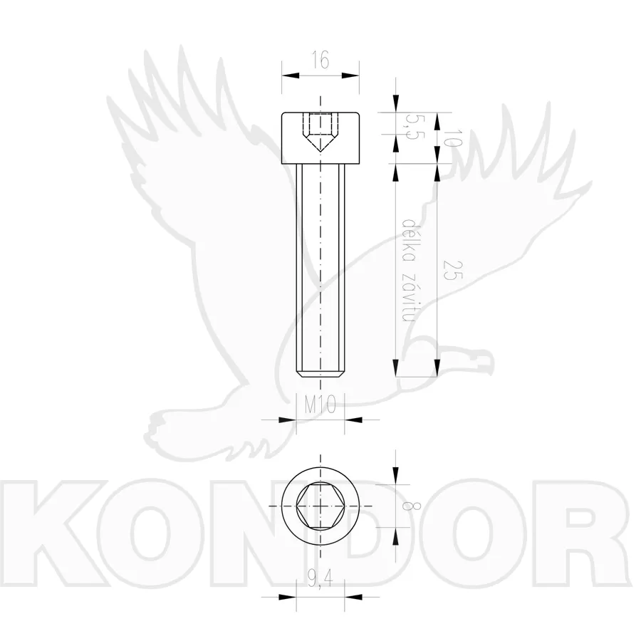 Metrický šroub s imbusovou válcovou hlavou. Materiál pozinkovaný. Pevnost 8,8. Rozměry M 10 × 25 mm.