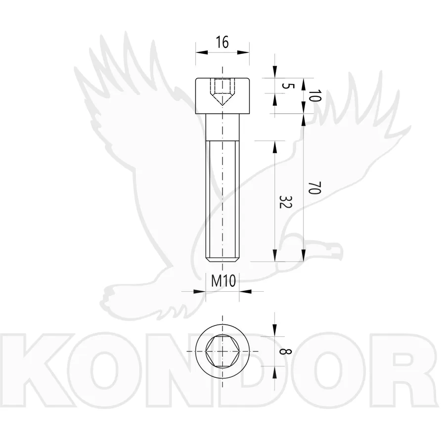 Metrický šroub s imbusovou válcovou hlavou. Materiál pozinkovaný. Pevnost 8,8. Rozměry M 10 × 70 mm.