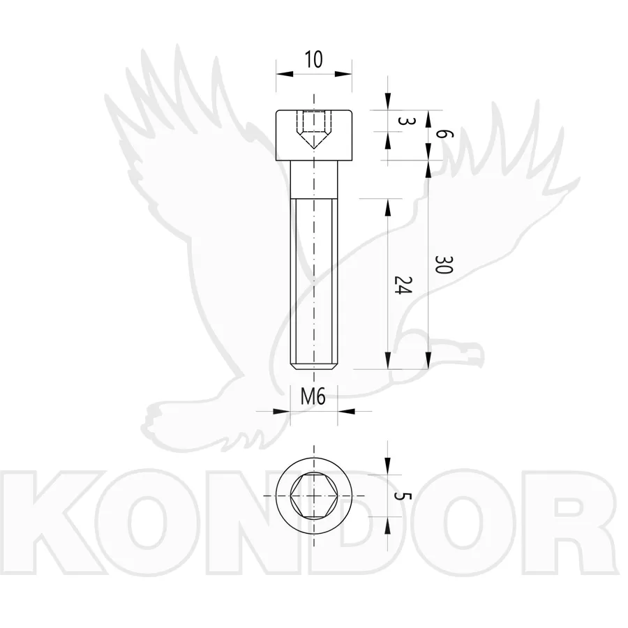 Metrický šroub s imbusovou válcovou hlavou. Materiál pozinkovaný. Pevnost 8,8. Rozměry M 6 × 30 mm.
