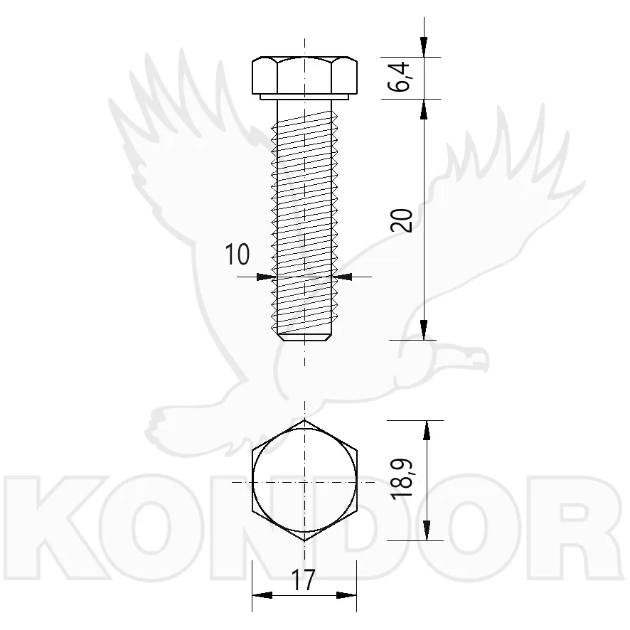 Šroub se šestihranou hlavou a celým závitem. Pevnost 8.8. Určen pro spojení materiálu. Materiál bílý pozink. Rozměry M 10 × 20 mm.