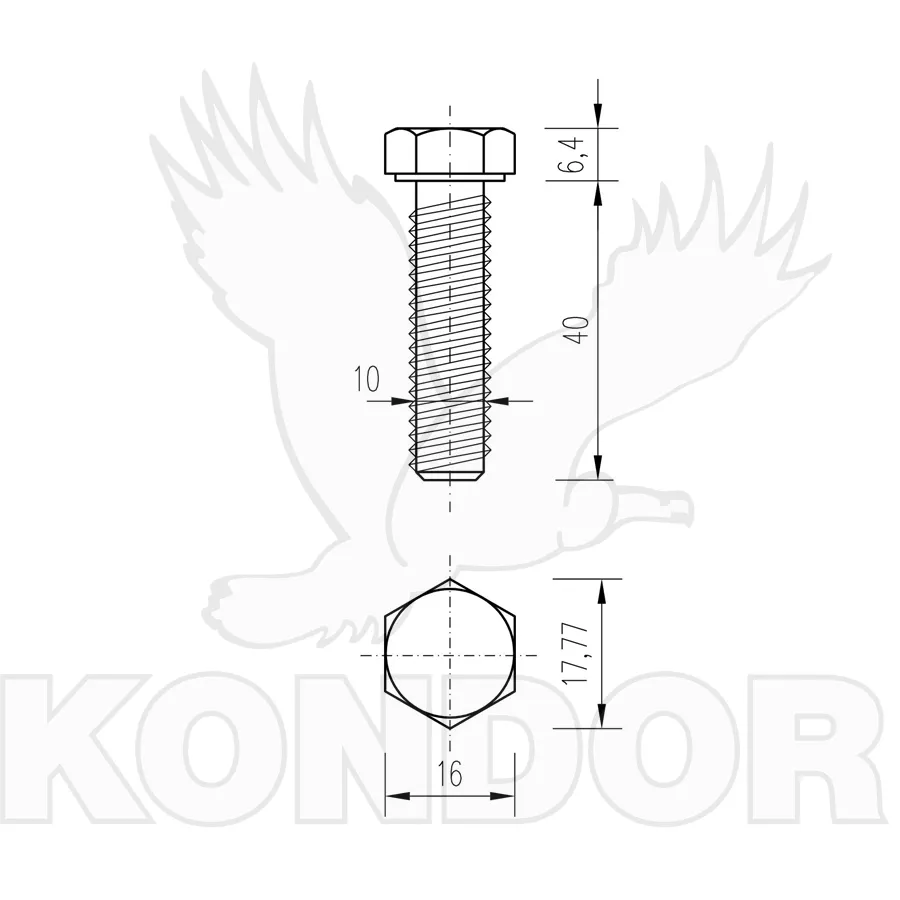 Šroub se šestihranou hlavou a celým závitem. Pevnost 8,8. Určen pro spojení materiálu. Materiál ocel. Rozměry M 10 × 40 mm.