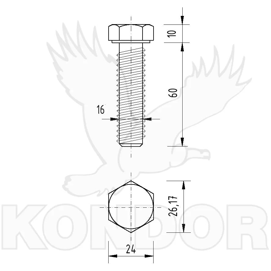 Šroub se šestihranou hlavou a celým závitem. Pevnost 8,8. Určen pro spojení materiálu. Materiál ocel. Rozměry M 16 × 60 mm.