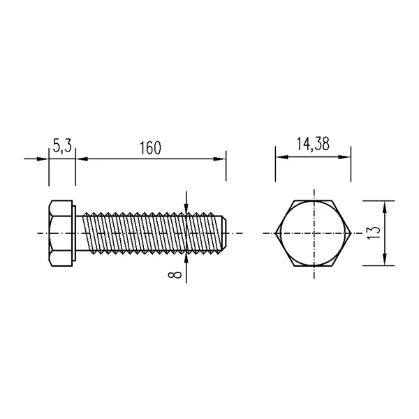 Šroub se šestihrannou hlavou a celým závitem. Pevnost 8.8. Určen pro spojení materiálu. Materiál bílý pozink. Rozměry M 8 × 160 mm.