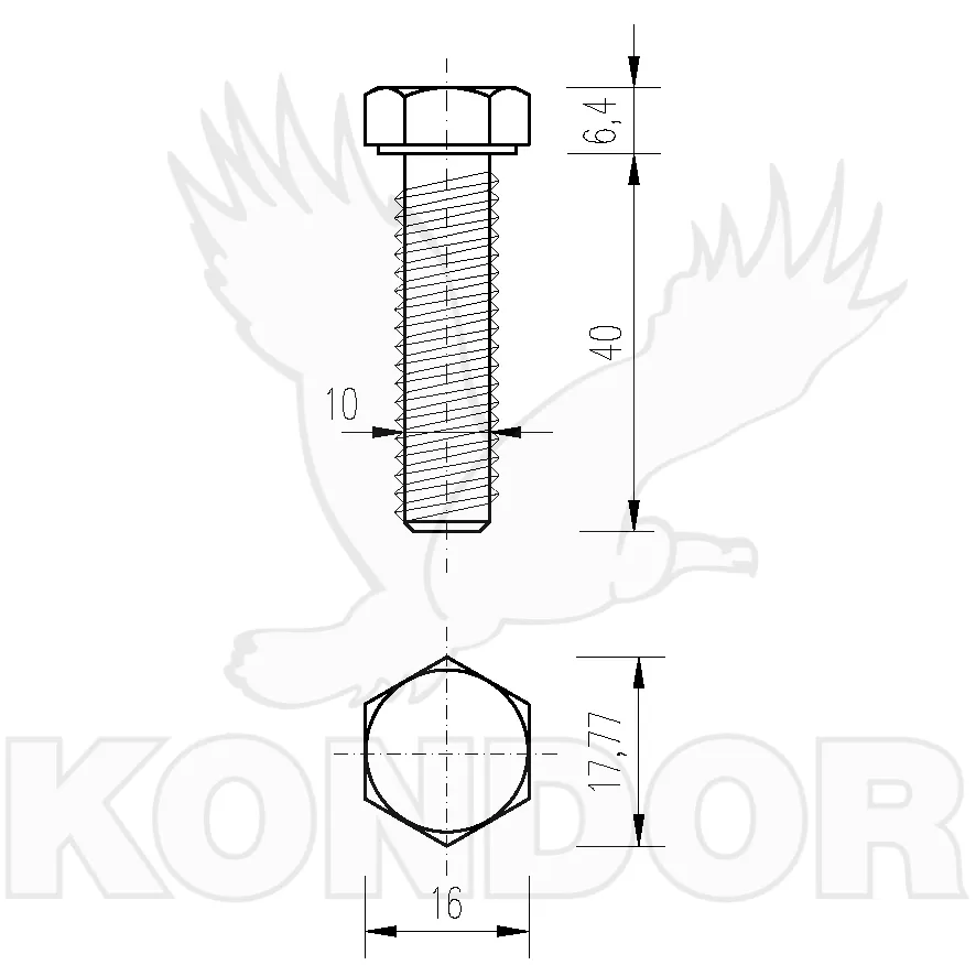 Šroub se šestihranou hlavou a celým závitem. Pevnost 8,8. Určen pro spojení materiálu. Materiál bílý pozink. Rozměry M 10 × 40 mm.