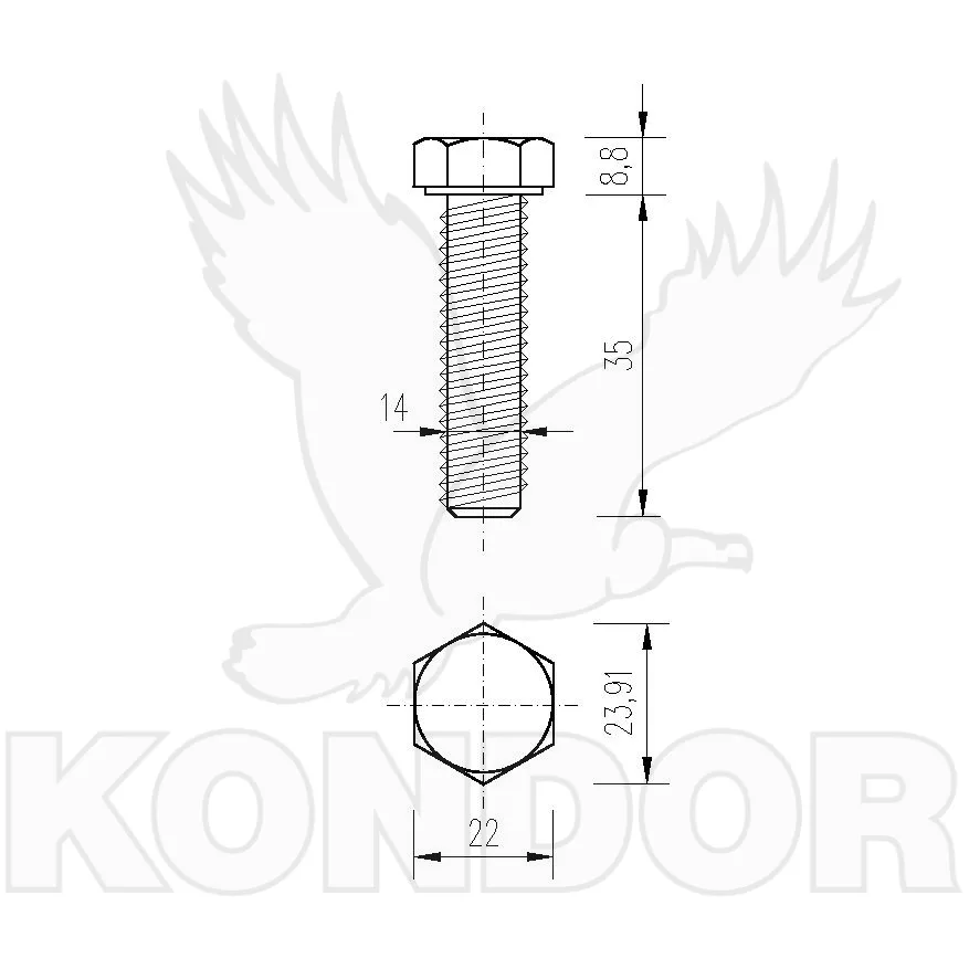 Šroub se šestihranou hlavou a celým závitem. Pevnost 8,8. Určen pro spojení materiálu. Materiál bílý pozink. Rozměry M 14 × 35 mm.