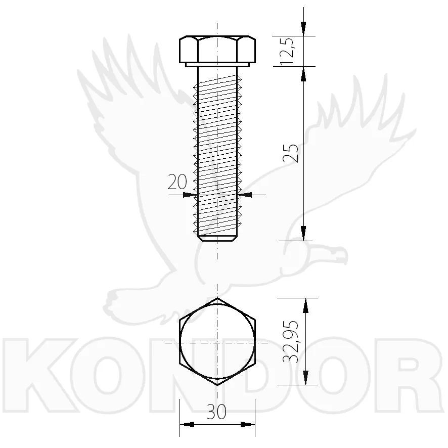 Šroub se šestihrannou hlavou a celým závitem. Pevnost 8.8. Určen pro spojení materiálu. Materiál bílý pozink. Rozměry M 20 x 25 mm.
