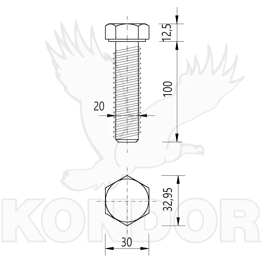 Šroub se šestihrannou hlavou a celým závitem. Pevnost 8.8. Určen pro spojení materiálu. Materiál bílý pozink. Rozměry M 20 × 100 mm.