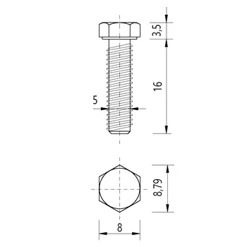 Šroub se šestihranou hlavou a celým závitem. Pevnost 8,8. Určen pro spojení materiálu. Materiál bílý pozink Rozměry M 5 × 16 mm.