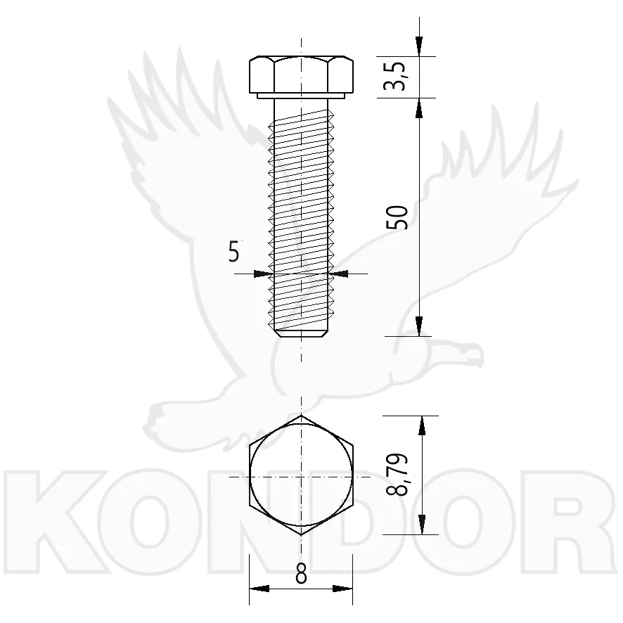 Šroub se šestihranou hlavou a celým závitem. Pevnost 8,8. Určen pro spojení materiálu. Materiál bílý pozink Rozměry M 5 × 50 mm.