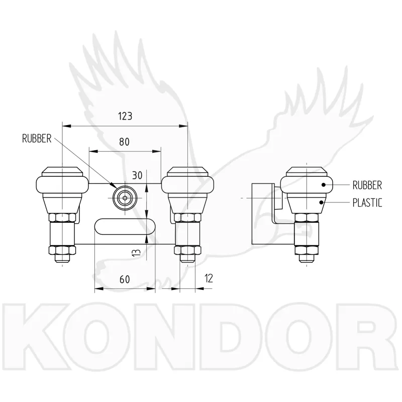 Horní koncový pozinkovaný doraz posuvné brány s naváděcími rolnami a gumovým nárazníkem.