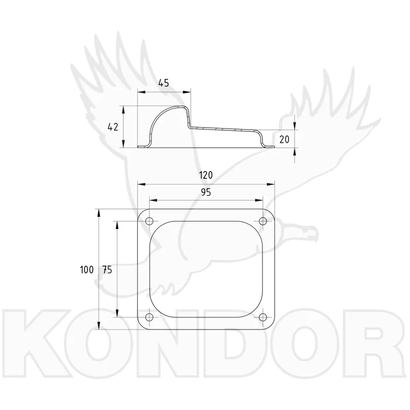 Vratová pozinkovaná zarážka k přišroubování na zem. Rozměry 120 x 100 x 42 mm.