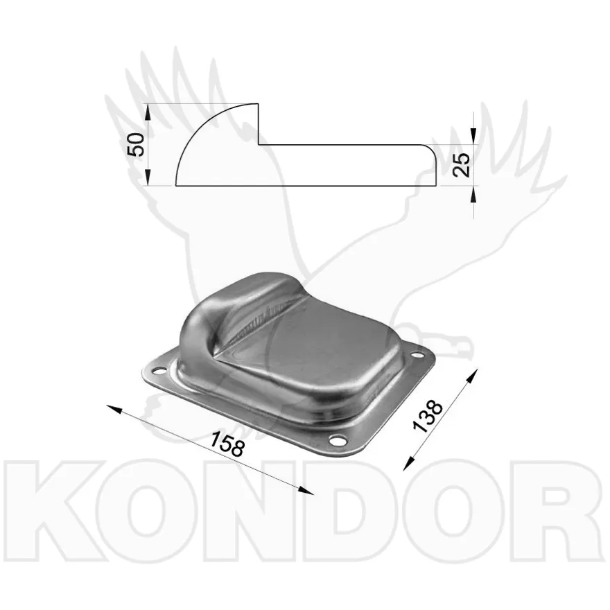 Vratová pozinkovaná zarážka k přišroubování na zem. Rozměry 158 x 138 x 50 mm.