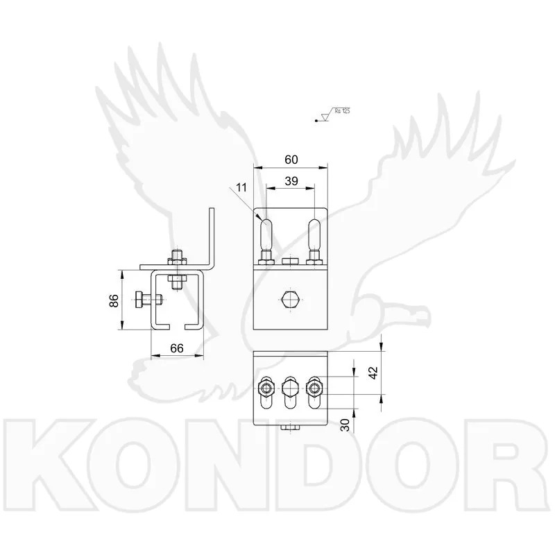 Boční pozinkovaný držák pro posuvné brány. Rozměry 57 × 67 mm.