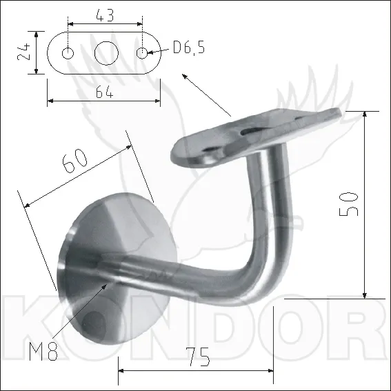 Nerezový držák madla pro upevnění na stěnu o průměru 42,4 mm. Průměr příruby 60 mm. Materiál AISI 304 v povrchové úpravě brus K320.