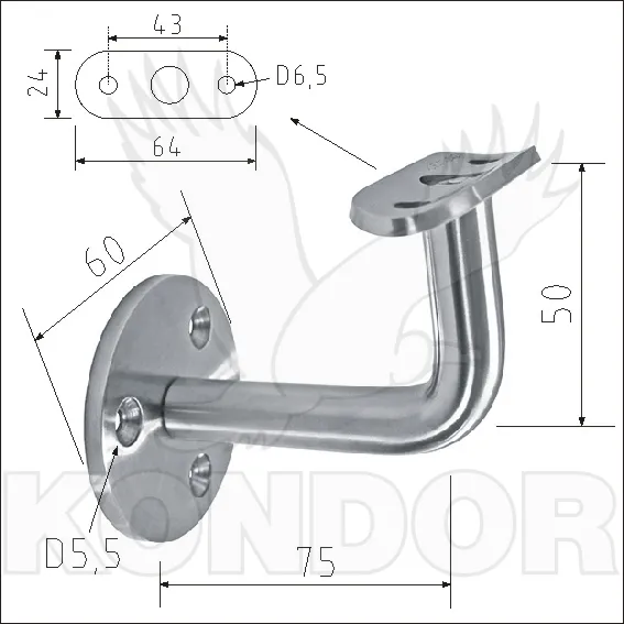 Nerezový držák madla o průměru 42,4 mm pro upevnění na stěnu. Průměr příruby 60 mm se třemi otvory. Materiál AISI 304 v povrchové úpravě brus K320.