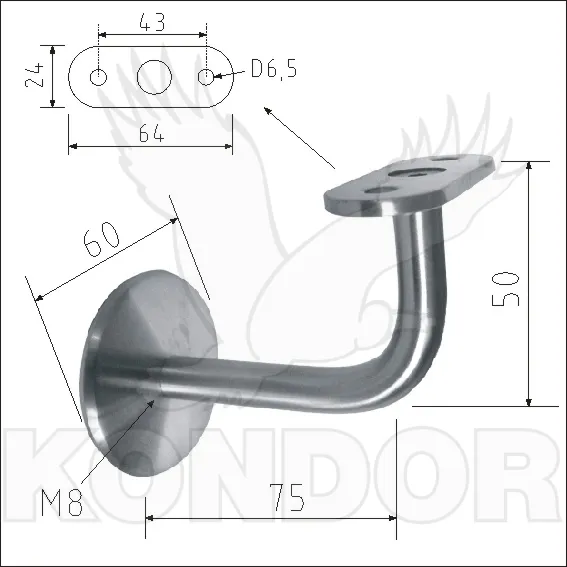 Nerezový držák pro ploché madlo s připevněním na stěnu. Příruba o průměru 60 mm. Materiál AISI 304 v povrchové úpravě brus K320.
