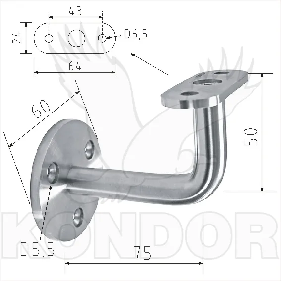 Nerezový držák hranatého madla pro upevnění na stěnu. Průměr příruby 60 mm. Rozměr madla 75 x 50 mm se třemi otvory. Materiál AISI 304 v povrchové úpravě brus K320.
