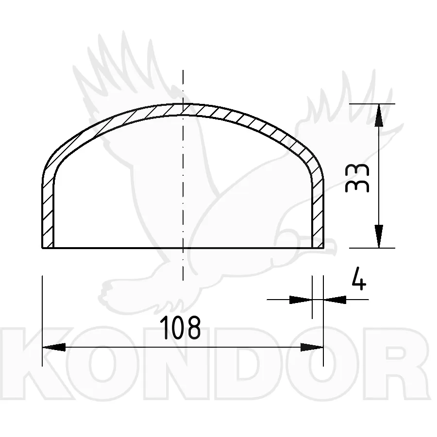 Hluboce klenutá záslepka na ukončení trubky. Průměr 108 mm. Tloušťka 4 mm. Výška 33 mm.