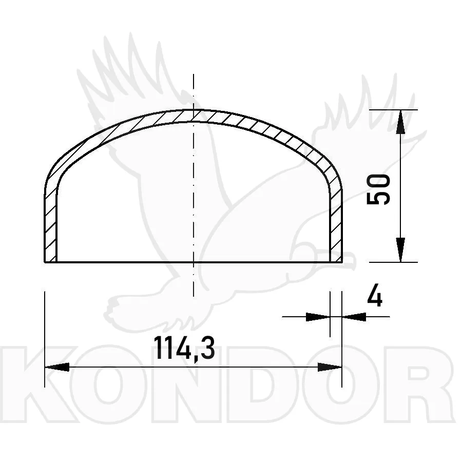 Hluboce klenutá záslepka na ukončení trubky. Průměr 114,3 mm. Tloušťka 4 mm. Výška 50 mm.