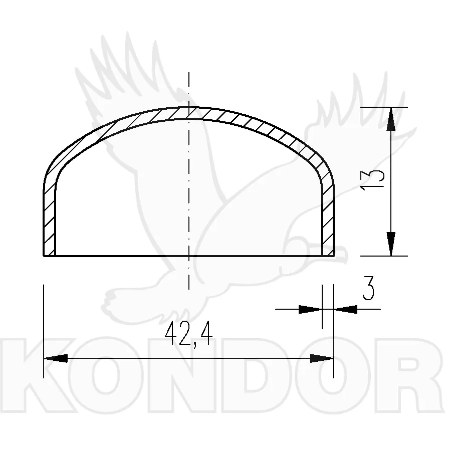 Hluboce klenutá záslepka na ukončení trubky. Průměr 42,4 mm. Tloušťka 3 mm. Výška 13 mm.
