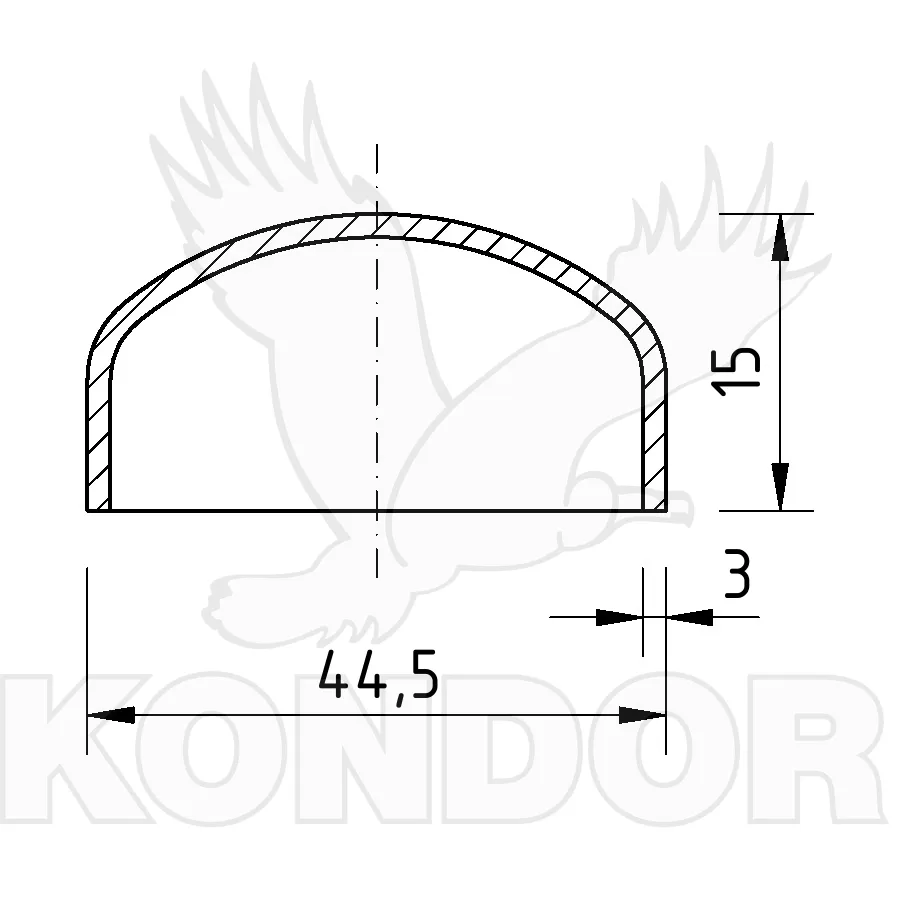 Hluboce klenutá záslepka na ukončení trubky. Průměr 44,5 mm. Tloušťka 3 mm. Výška 15 mm.