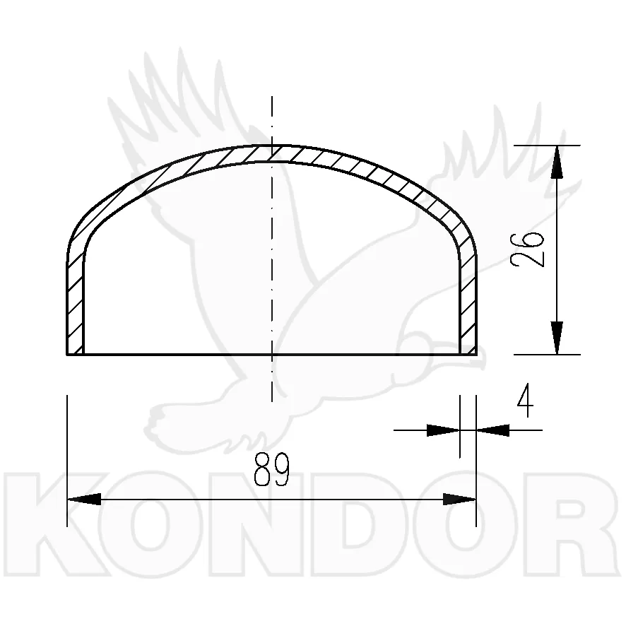 Hluboce klenutá záslepka na ukončení trubky. Průměr 89 mm. Tloušťka 4 mm. Výška 26 mm.