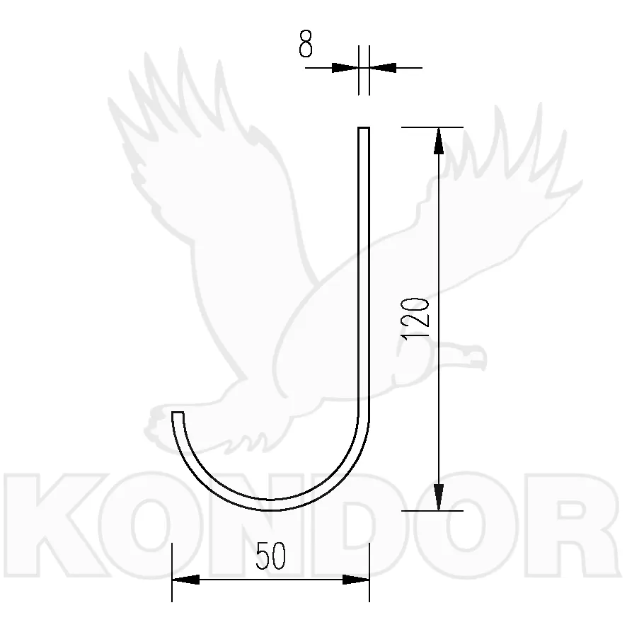 Háček ve tvaru J určený pro přichycení trapézového plechu k trubkám. Pozinkovaný povrch. Průměr 8 mm. Výška 120 mm. Šířka 50 mm.