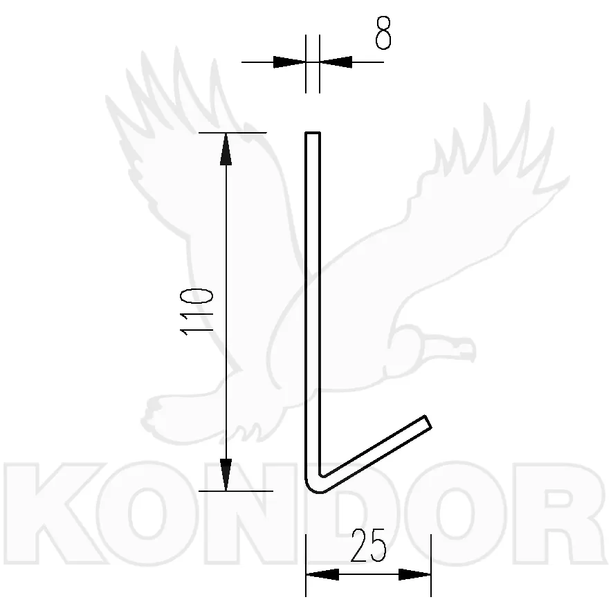 Háček ve tvaru L určený pro přichycení trapézového plechu k jeklům. Pozinkovaný povrch. Průměr 8 mm. Výška 110 mm. Šířka 25 mm.