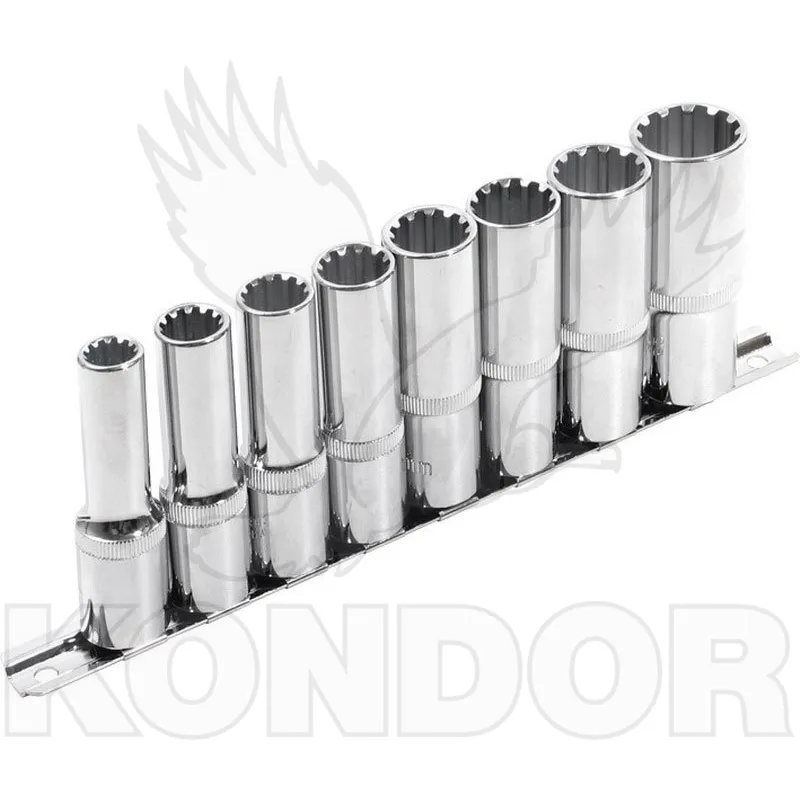 Sada osmi kusů hlavic určených pro 6 a 12 hranné matky (imbusy a torxy). Hlavice jsou pro systém gola 1/2".